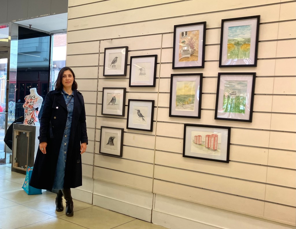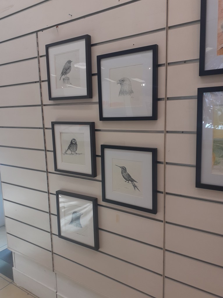 I often pop into the local art gallery and on this occasion I asked about submitting some work. It was accepted by email and then one morning I took some sketches and watercolours down to the gallery…and there it was, the next day, beautifully and thoughtfully displayed. My work! I had to pinch myself! What a proud moment it was. Haha! Now the wall outside my study is bare!